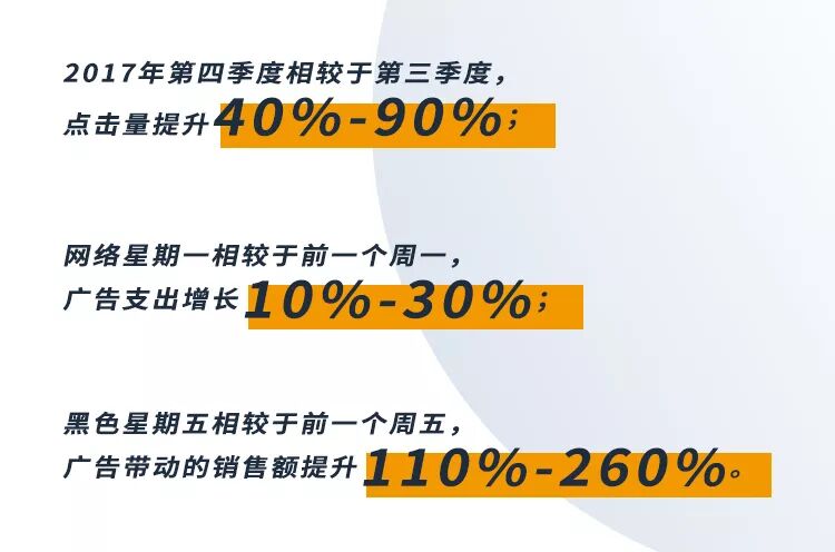 再来看2017年第四季度广告趋势图,图中显示广告趋势从9月开始上扬,随着第四季度的到来愈加强劲,最终在黑色星期五以及网络星期一达到高峰,这与卖家的销售增长和顾客的购买趋势完全一致。