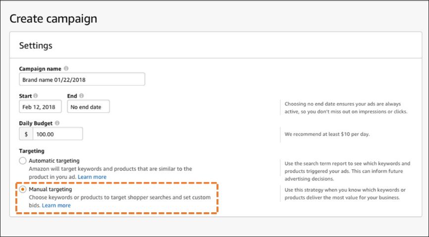 1、 按照以往的广告活动步骤,需要设置广告活动的名称、开始日期和每日预算,然后选择“手动投放 (Manual targeting)”。如设置日期为今天,没有结束日期保持广告始终在线,预算为每日100美元。