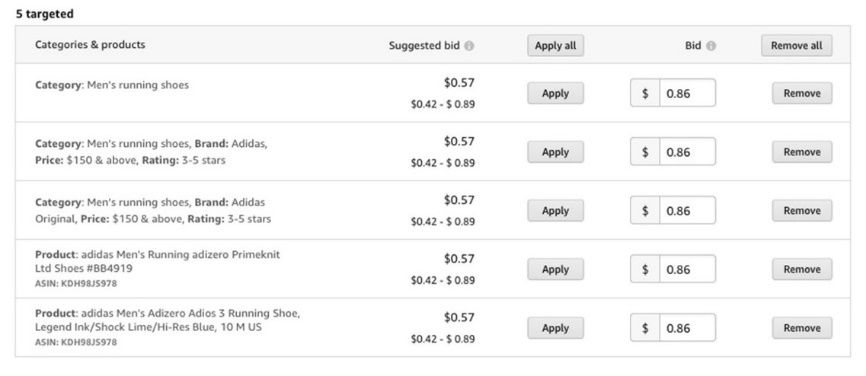 在“投放”框下方可找到所有ASIN和品类投放,并可调整投放设置的默认竞价。