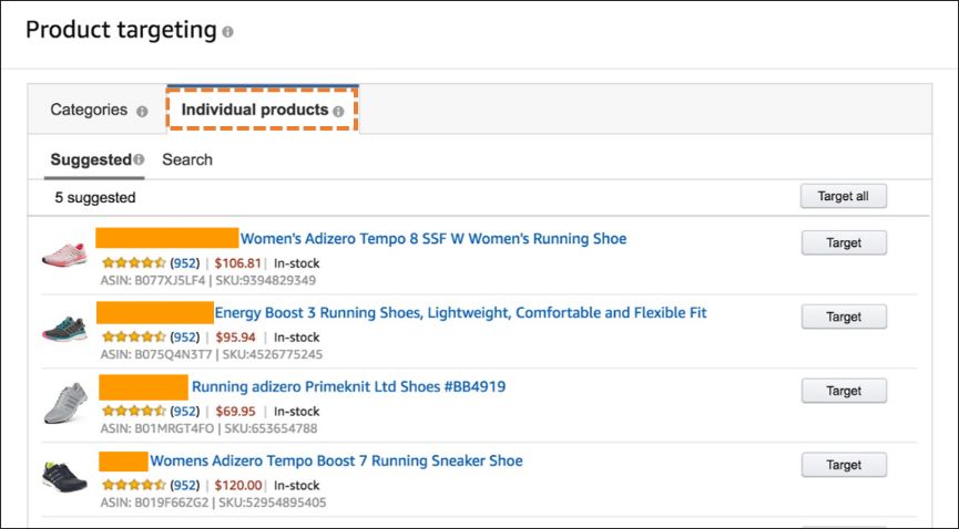 ASIN投放是针对单个商品投放。建议选择与推广商品紧密相关的 ASIN,如某个品牌高度相关的某款鞋。