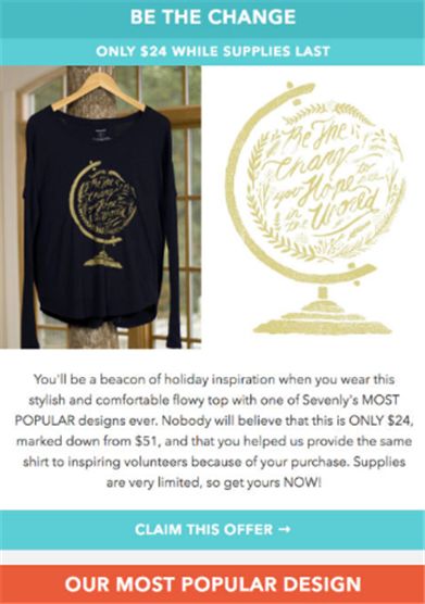 服饰品牌Sevenly就是一个值得借鉴的有趣例子,它侧重于强调:通过购买,你可以帮助到其他人。虽然这以信息主要是在他们的标题中传达,但他们的行动召唤按钮也值得关注。