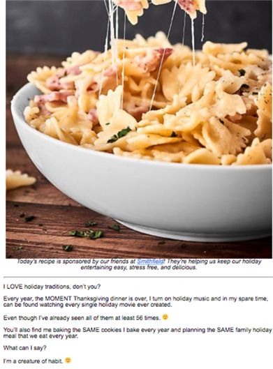 或者,卖家可以在邮件中提供利用剩余火腿烹饪美味食物的创意攻略,例如Show Me The Yummy的示例: