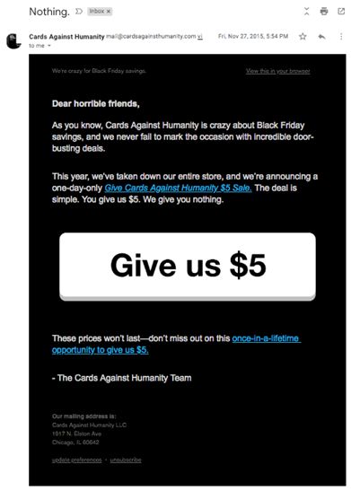 卖家请务必确保在即的行动召唤具有描述性、令人信服、有趣且处于显眼的位置,说服客户不要错过这一优惠立即购买。成功的行动召唤取决于目标受众。Cards Against Humanity的案例就值得参考,另外其简短有趣的主题也是一大亮点。