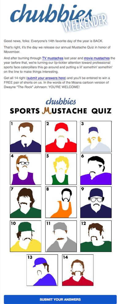 卖家还可以围绕主题创建内容,例如发布带有小胡子标识的照片、视频或图文,或发送有关活动主题的电子邮件、有趣的奇闻和关于小胡子的笑话。商家还可以创建有关于胡子的互动游戏。
