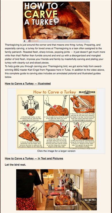 如果品牌计划展开多个假日营销活动,如何保证本次活动的特殊性?有时甚至无需让邮件更精美,只需内容有趣或实用就有可能适合目标受众。Man of Manliness的例子就十分值得借鉴。其通过邮件传授客户制作火鸡的办法。阅读之后,显然每个用户都想拥有同款厨具。