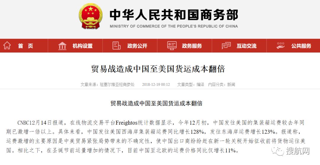 根据在线物流交易平台Freightos统计数据显示,今年12月初,中国发往美国的集装箱运费较去年同期已激增一倍以上。具体来看,中国发往美国西海岸集装箱运费同比增长128%,发往东海岸运费增长123%。