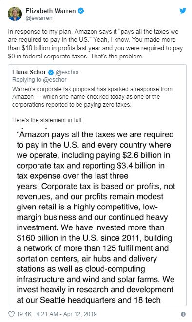 目前,已经有人对亚马逊通过税务筹划免征税的行为表达了不满。据外媒报道,周四美国民主党参议员伊丽莎白·沃伦(Elizabeth Warren)表示要对企业征收利润税,沃伦表示,根据她的计划,亚马逊在2018年将被征收6.98亿美元的税,但是亚马逊并没有做到。