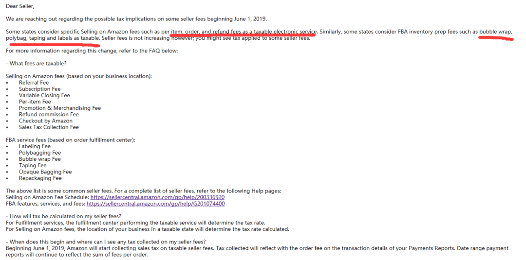 根据卖家提供的邮件内容显示,亚马逊正在探讨从2019年6月1日开始对某些卖方费用可能产生的税务影响。